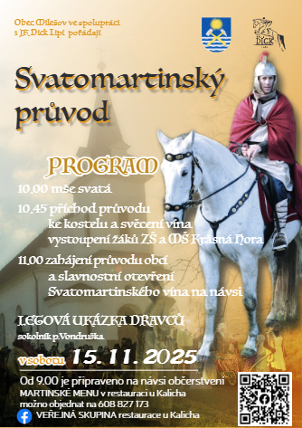 Obec Milešov zve všechny na tradiční Svatomartinský průvod, který se uskuteční v sobotu 15. listopadu 2025. Zahájení mše je naplánováno na 10:00 hodin, následovat bude bohatý doprovodný program.