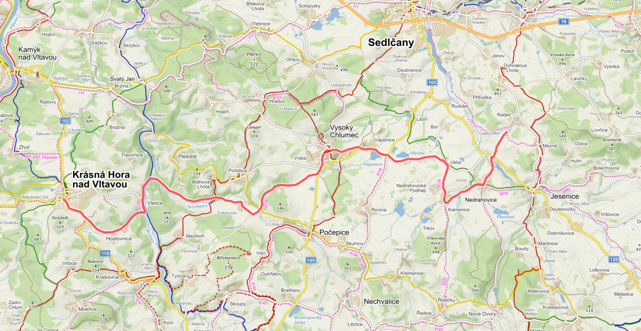 Radeč, křižovatka (křížení s trasou č. 11) - osada Radeč - Nedrahovice - Kamenice - Úklid - Vápenice, křižovatka (křížení s trasou č. 8139) - Vápenice - Vysoký Chlumec (křížení s trasou č. 8137) - Zvěstovice - Vletice - Hostovnice - Hostovnice, křižovatka (křížení s trasou č. 8141) - Krásná Hora (křížení s trasami č. 111, 301, 8141)